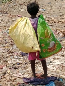 Ze hebben ons al zien aankomen en roepen elkaar om erbij te komen. Degenen die slippers aan hebben zetten deze neer en gaan hierop zitten. Anderen zitten gewoon zo op de grond tussen al het afval wat er ligt. Als er een stuk zeil is gevonden, wordt dat gebruikt. Om ons heen lopen de honden en varkens die op zoek zijn naar wat eetbaars.